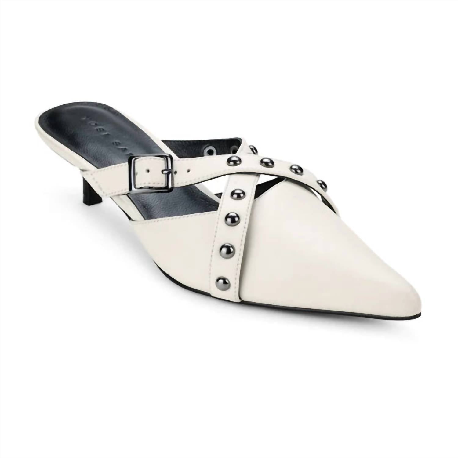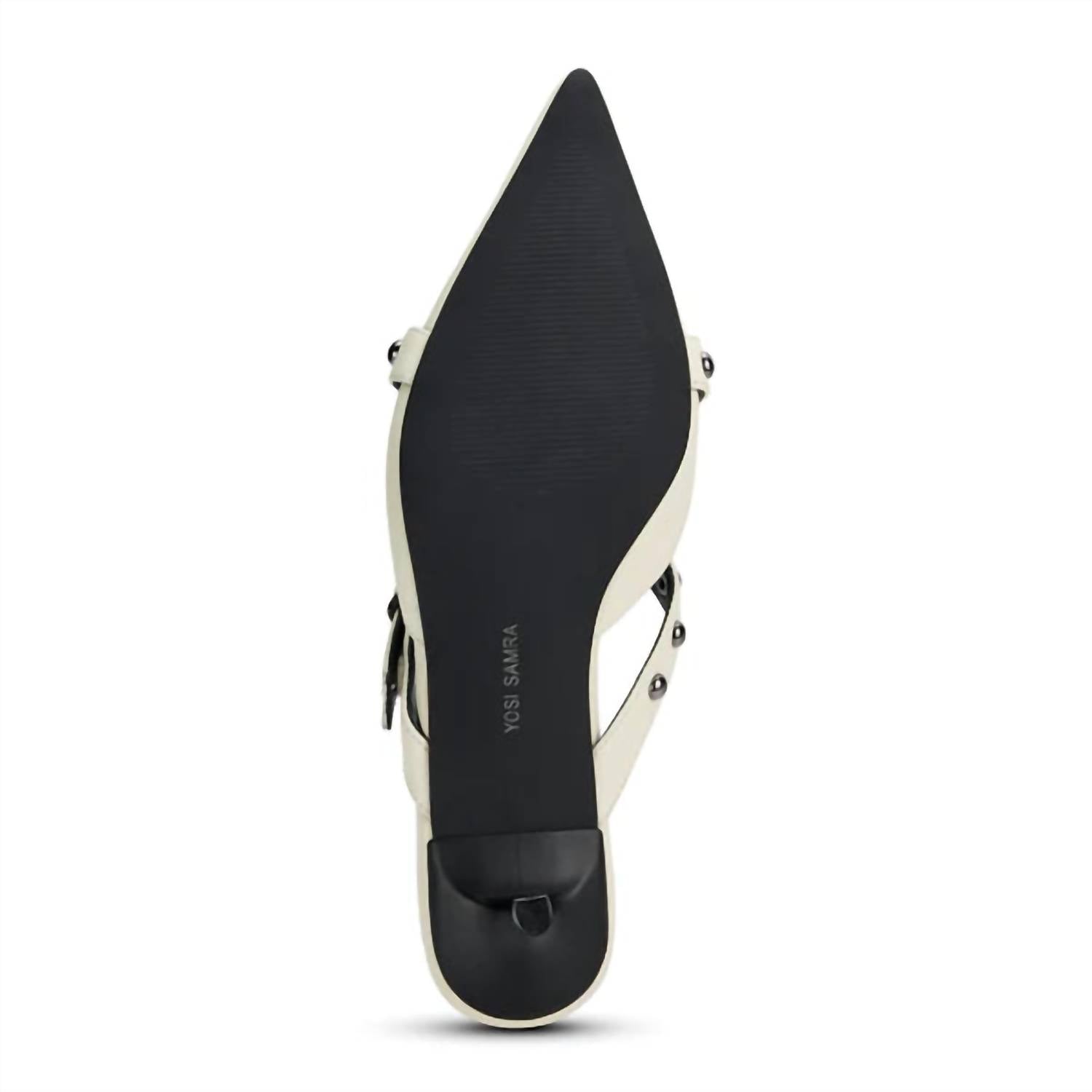 Pair these beauties with your favorite skinny jeans or dress for a night out on the town. Introducing the Women's Alexis Leather Kitten Heel by YOSI SAMRA, a pointed-toe mule that redefines sophistication in bone leather. This minimalist heel is adorned with gleaming studs on sleek crossover straps, ensuring a perfect fit and striking appearance. Crafted for the modern woman, its kitten heel offers a low elevation, ideal for evening events or any stylish spring occasion. Slip into this elegant silhouette and embrace effortless polish and versatility.