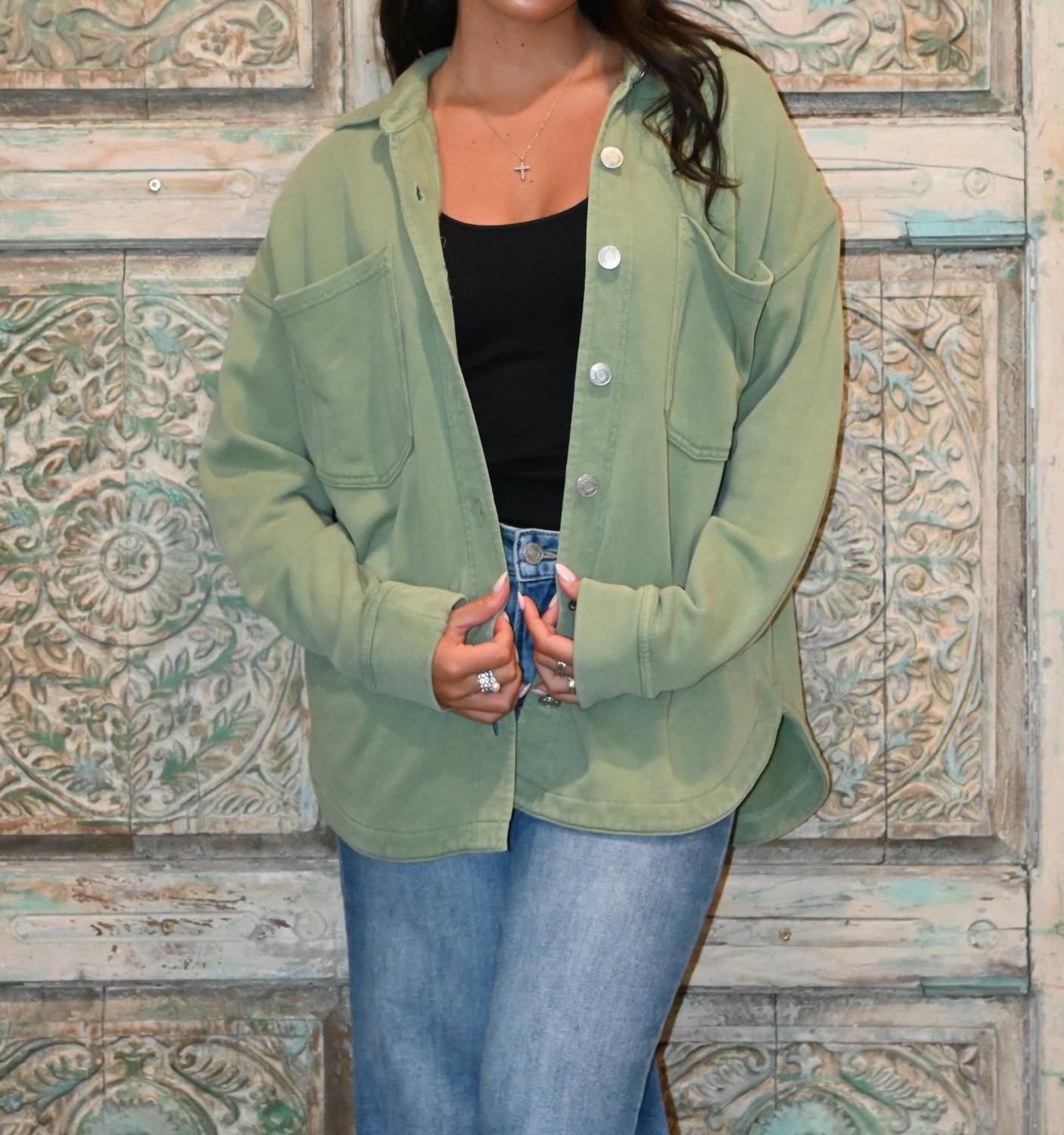 A casual yet cool jacket that every closset needs. Elevate your style with the All Day Button Front Shacket by Z Supply, an avocado-hued must-have for your spring wardrobe. Featuring long sleeves and a stylish curved hem, this oversized fit jacket is crafted from 100% cotton French terry for optimal comfort. Designed with practical chest patch pockets and a button closure for easy wear, it offers a shoulder length of 27 1/2". Effortless to maintain, simply machine wash on a cold, gentle cycle to keep it looking its best.