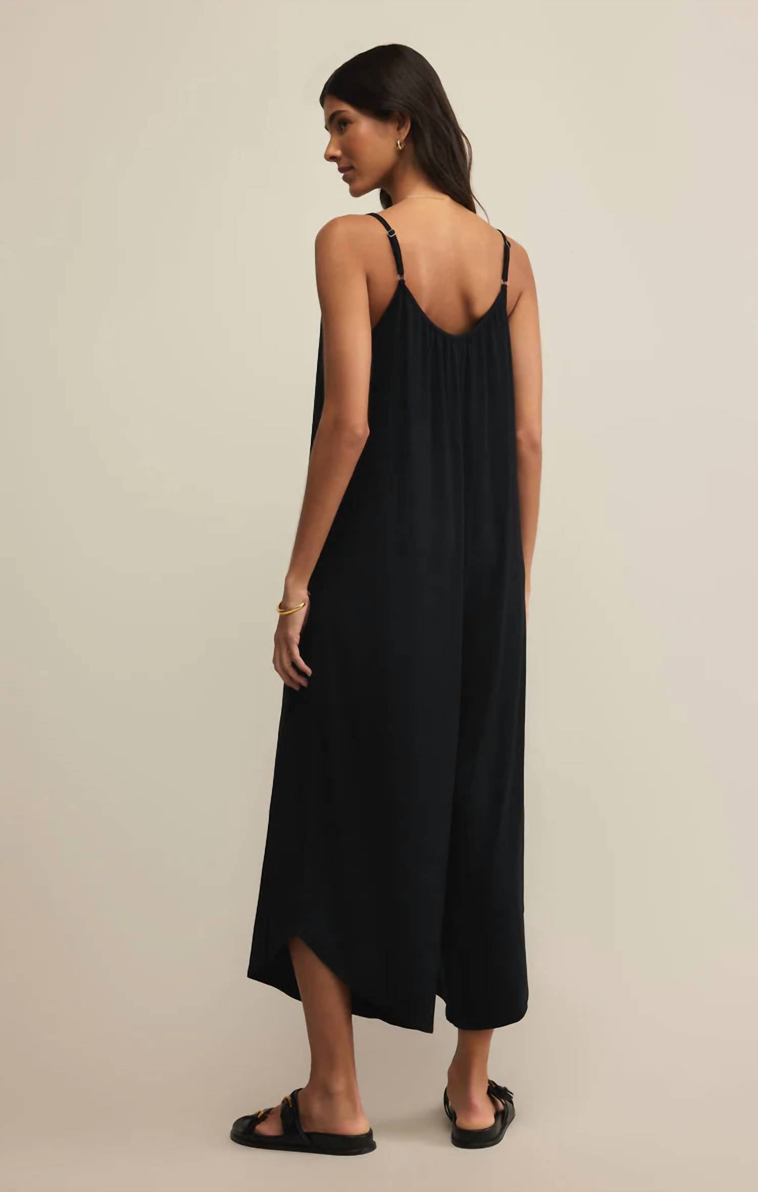 The perfect outfit choice when you you need something quick to throw on and still want to look efforlessly cool. The Allison Flared Jumpsuit by Z Supply offers a chic streetwear look in classic black, perfect for a vacation vibe. Designed with a sleeveless cut, it's crafted from midweight 85% Rayon, 5% Spandex sleek jersey, providing a relaxed fit and flared leg style. The jumpsuit features a scoop neckline, wide straps, and side seam pockets for convenience, with a pull-on closure for ease of wear. Care is simple with machine wash cold and lay flat to dry instructions.