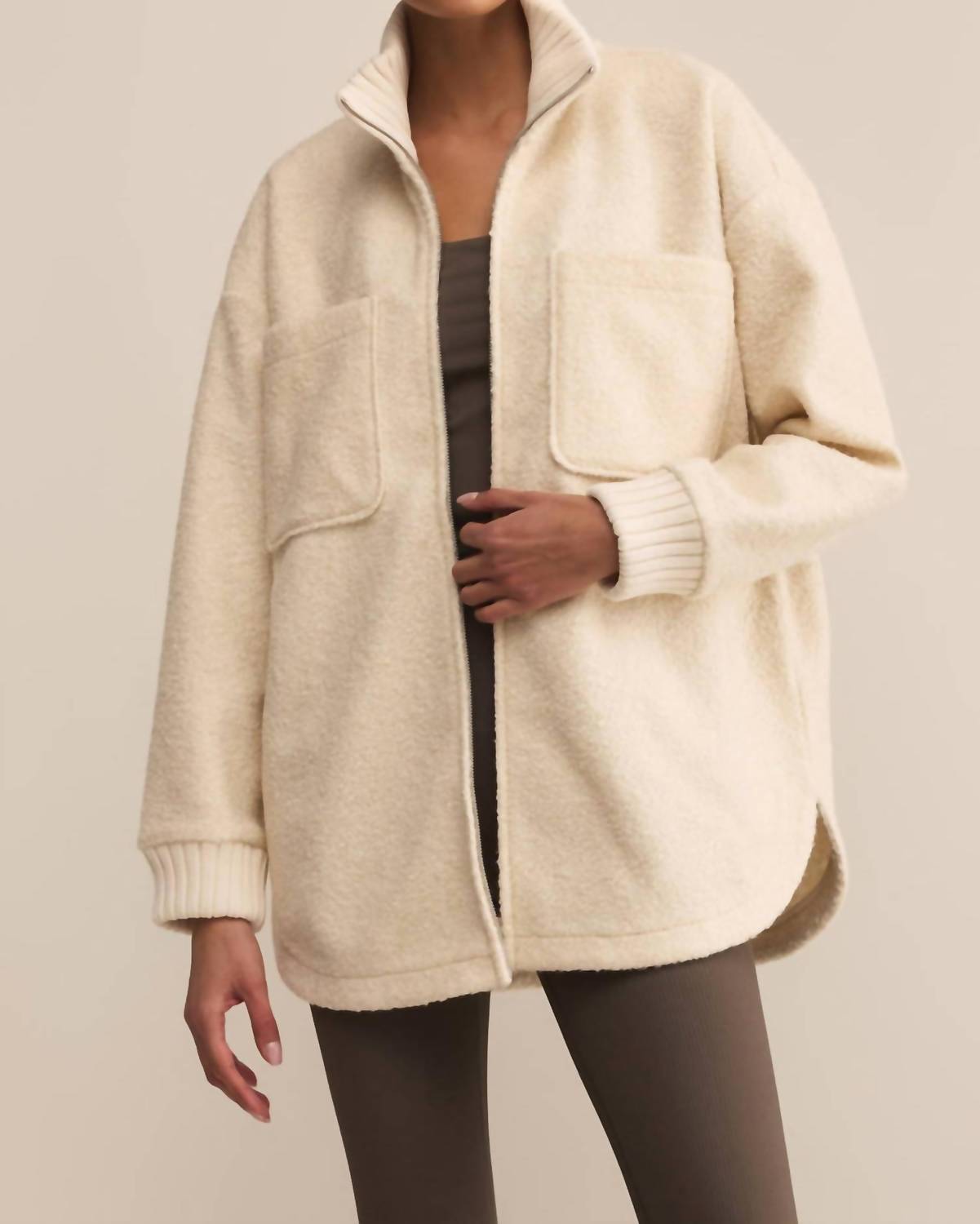 A casual yet cool jacket that every closset needs. Introducing the Downhill Jacket by Z Supply, a chic and cozy addition to your winter wardrobe in a cool crystal cream. With long sleeves and an oversized fit, this jacket boasts a collared neckline and features handy large patch pockets perfect for a minimalist, vacation-ready look. Crafted from 100% Tencel poodle knit, its heavy soft wash texture adds to the midweight comfort. Closure: Zip closure. Care: Machine wash, line dry. Length from shoulder: 29.5 inches.