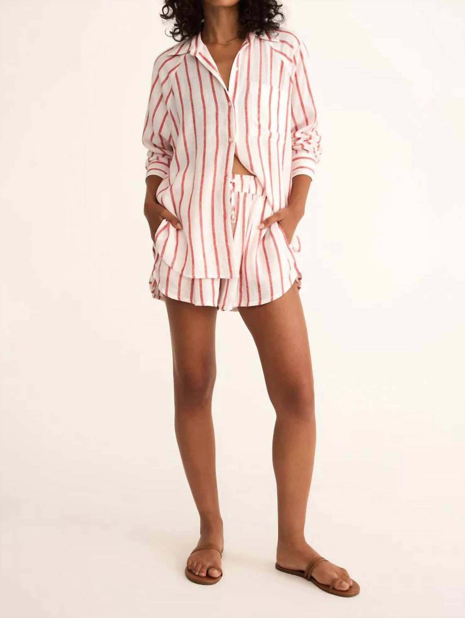 High-waist is here to stay and we especially love this style short. Elevate your summer style with The Perfect Linen Stripe Short by Z Supply, presented in a charming Cabana Red. These high-rise shorts feature a 2 5/8" inseam, lined for comfort, and crafted from a blend of 55% Linen and 45% Rayon for a textured finish. The elastic waistband with a drawcord ensures a perfect fit, complemented by side seam pockets. Care for these shorts by machine washing on a gentle cycle and hanging to dry to maintain their fresh look.