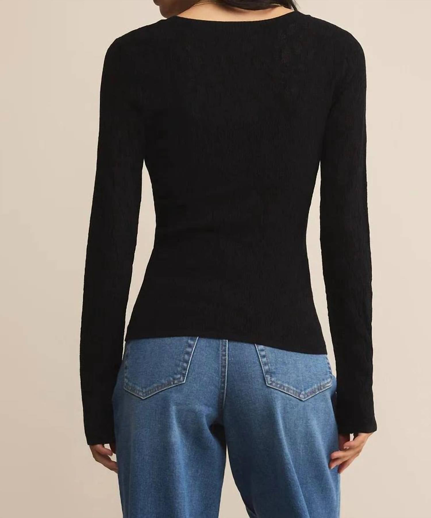 A long sleeve top you can wear with denim, skirts, well... just about anything! Meet the Tibi Scoop Mesh Sweater by Z Supply, a chic addition to any spring wardrobe. This black sweater features long sleeves and a flattering scoop neck design, perfect for layering or styling on its own. Crafted from a soft viscose blend with a textured finish, it measures 21.5 inches from the shoulder for a relaxed yet elegant look. Care for this piece by hand washing and laying flat to dry, ensuring it remains a go-to for your holiday parties and beyond.