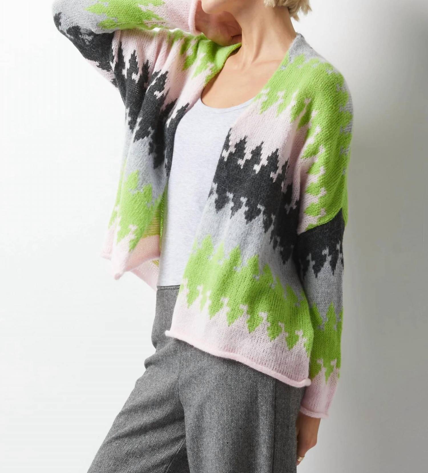 This cardigan will be a sweater-rotation favorite. Introducing the ZAKET & PLOVER Colorburst Open Front Cardigan, a vibrant addition to your fall or winter wardrobe. This long sleeve cardigan is crafted from a luxurious blend of 26% Merino Wool, 16% Mohair, 35% Acrylic, and 23% Nylon, ensuring a buttery soft texture and all-day warmth. Featuring a unique and playful pattern, it offers a boxy, loose fit for an effortlessly stylish and drapey look. Closure: Pull-on. Care: Machine wash. This seamless, pocket-free cardigan is perfect for layering and embracing the maximalist trend.