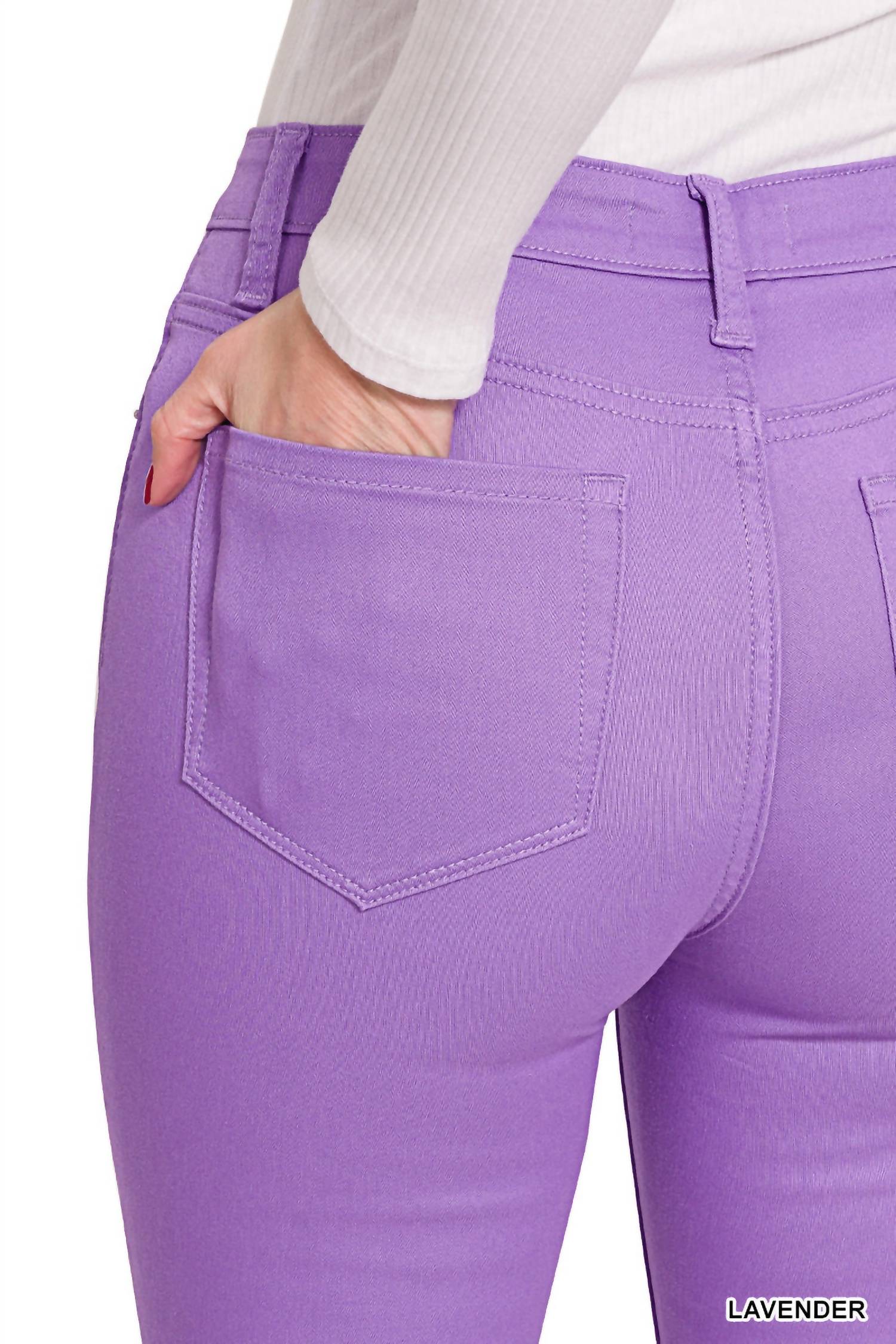 Everyone needs a good pair of skinny pants and this is a style you'll keep reaching for no matter the season. Experience effortless style with ZENANA's High Rise Skinny Denim Pants in a chic lavender hue. These women's pants boast a high-rise waist and a stretchy slim fit, offering both comfort and versatility. Made from a cotton blend composed of 58% cotton, 39% polyester, and 3% spandex, these pants feature a 28" inseam with a 10 3/4" front rise and are designed with a skinny leg and convenient button closure. Designed for minimalist fashion, they are machine washable and should be laid flat to dry, perfect for your spring dinner parties.