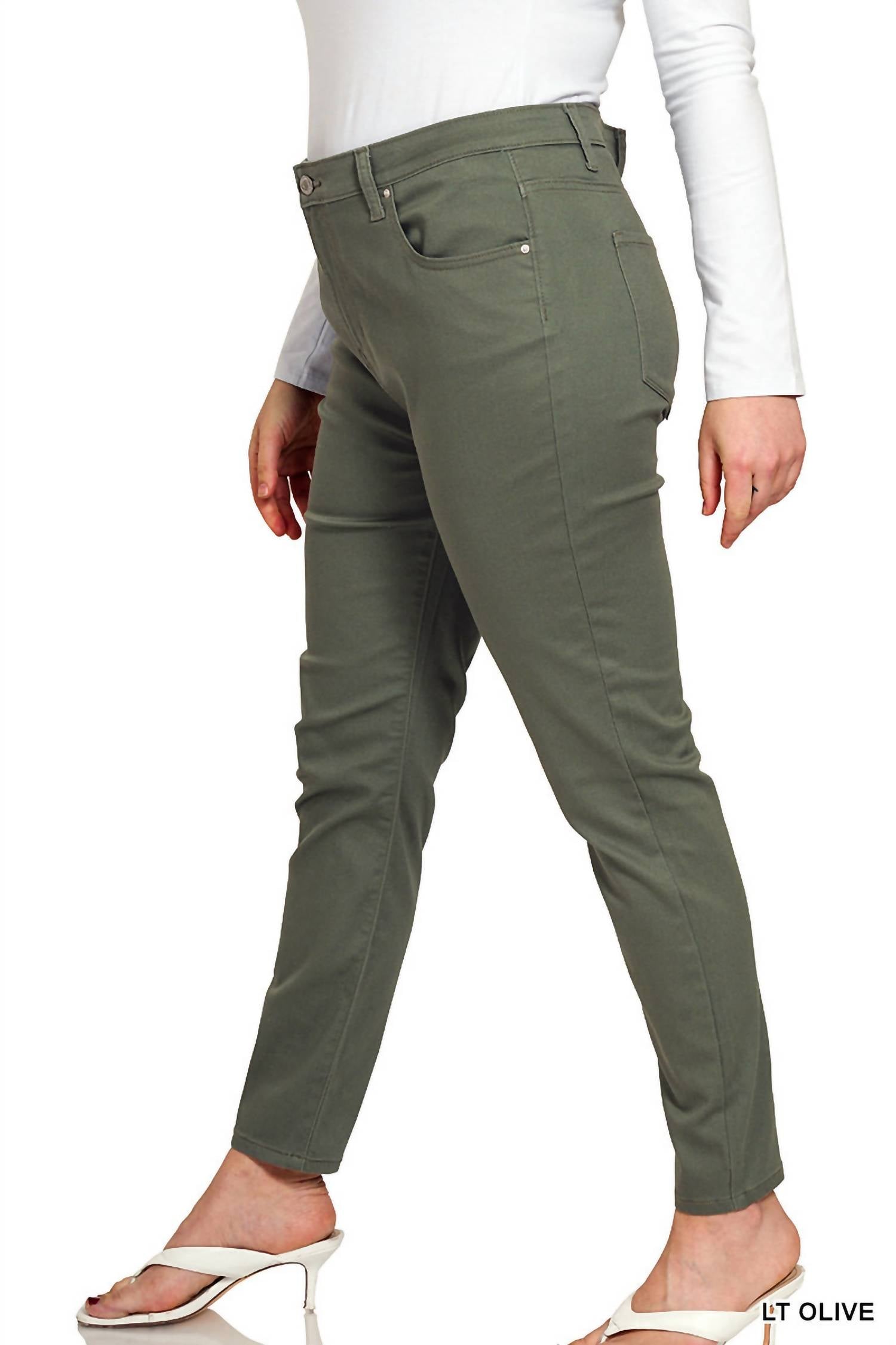 Everyone needs a good pair of skinny pants and this is a style you'll keep reaching for no matter the season. Elevate your style with the High Rise Skinny Denim Pants by ZENANA, a stunning addition to any wardrobe in a chic Light Olive hue. These slim fit pants are crafted from a comfortable cotton blend, boasting a high rise waist and a sleek skinny leg design. The button closure enhances the polished look, while the stretch fabric and five-pocket construction ensure a perfect fit. Measurements: Regular front rise is 10 3/4" with a 28" inseam; Plus front rise is 12 3/8" with a 28" inseam. Care instructions include machine wash and line dry, making these pants a practical choice for any dinner party or spring outing.