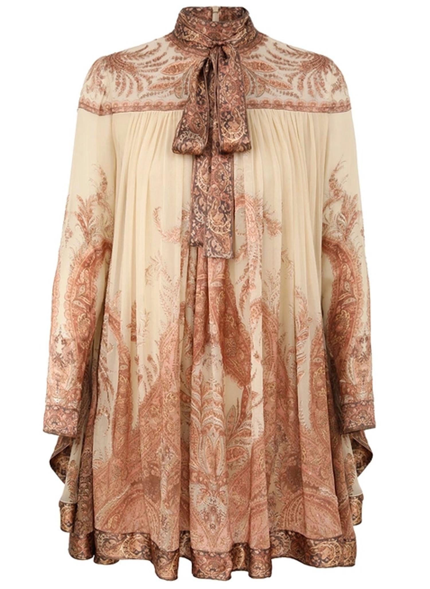 The perfect mini dress for those warmer months. Introducing the Hypnotic Batwing Mini Dress by Zimmermann, a statement piece perfect for an evening event. This cream paisley slip dress boasts long batwing sleeves and a mock neck, exuding a glamorous maximalist style. Featuring a removable necktie and gathering at the bust, this patterned dress also has an invisible zip closure at the center back for a seamless look. Care: Hand wash to maintain its pristine condition; ideal for celebrating occasions such as New Year's Eve.